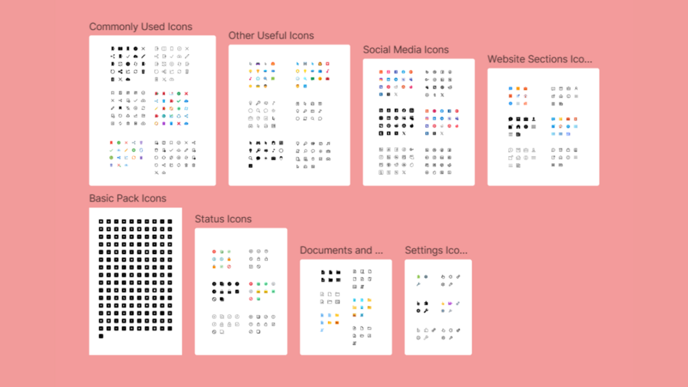 ✅ 500+ icons in multiple categories (commonly used, documents and folders, settings, social media, status, website sections, and other useful Icons )